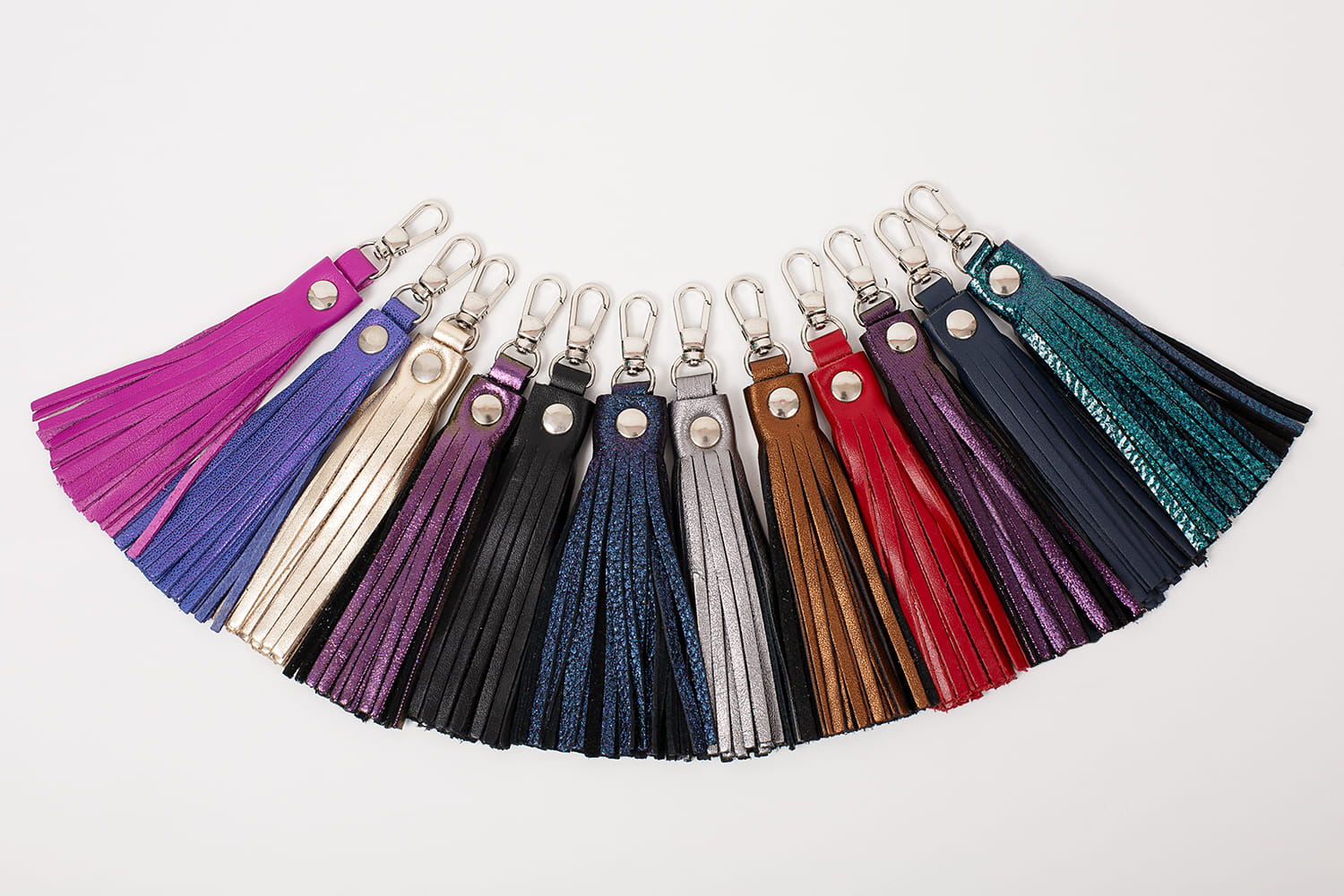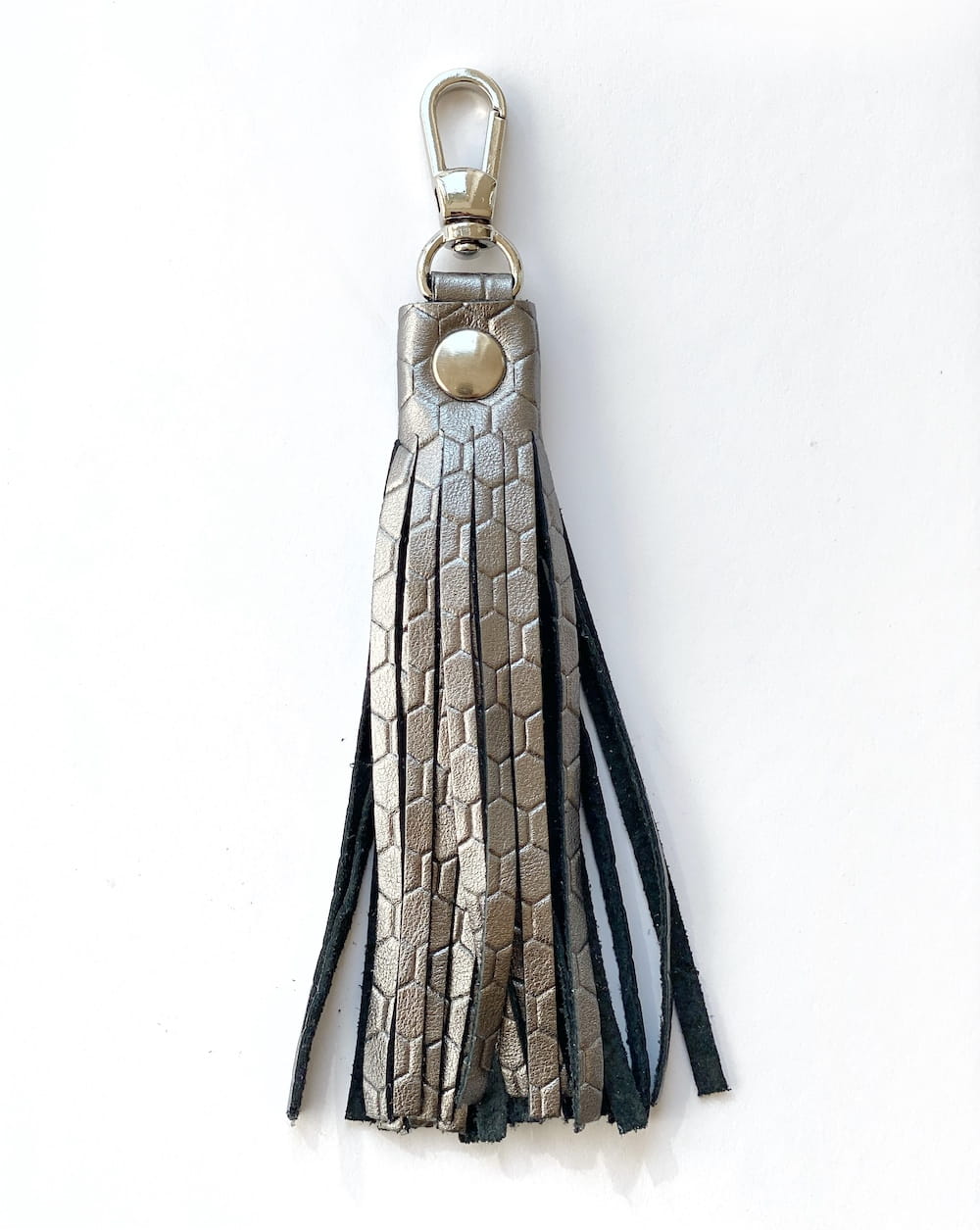 Frędzel - brelok ze skóry naturalnej w antracytowym z geometrycznymi tłoczeniami. Wyśmienicie odświeży i ozdobi każdą torebkę. Sprawdzi się również jako brelok do kluczy. Kolor karabińczyka srebrny.