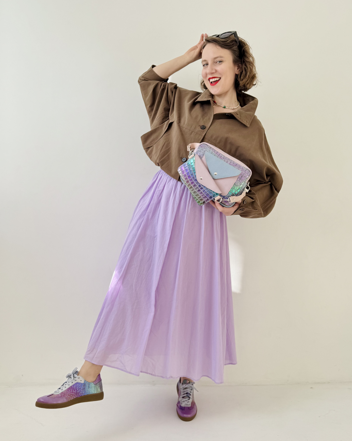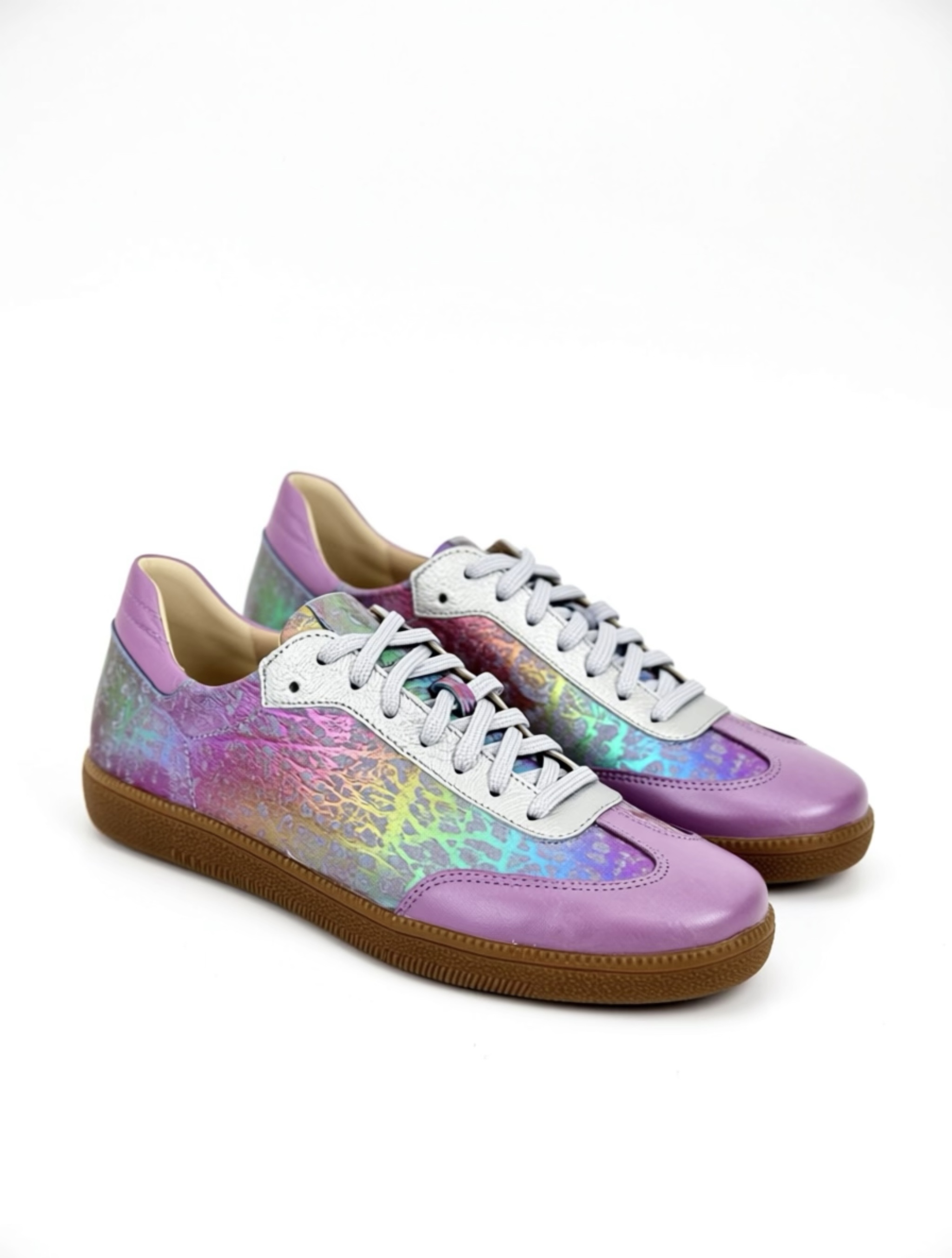 Tęczowa skóra charakteryzuje się bogactwem kolorów, które mogą różnić się układem i proporcją w porównaniu do egzemplarza przedstawionego na zdjęciach. Ma to związek z unikalnymi cechami materiału użytego do produkcji. W niektórych miejscach skóra posiada naturalne przetarcia, które dodają jej charakteru – to zamierzony efekt, który powstaje podczas produkcji. Z upływem czasu efekt ten może się pogłębiać, co jest naturalną cechą tego rodzaju skóry.