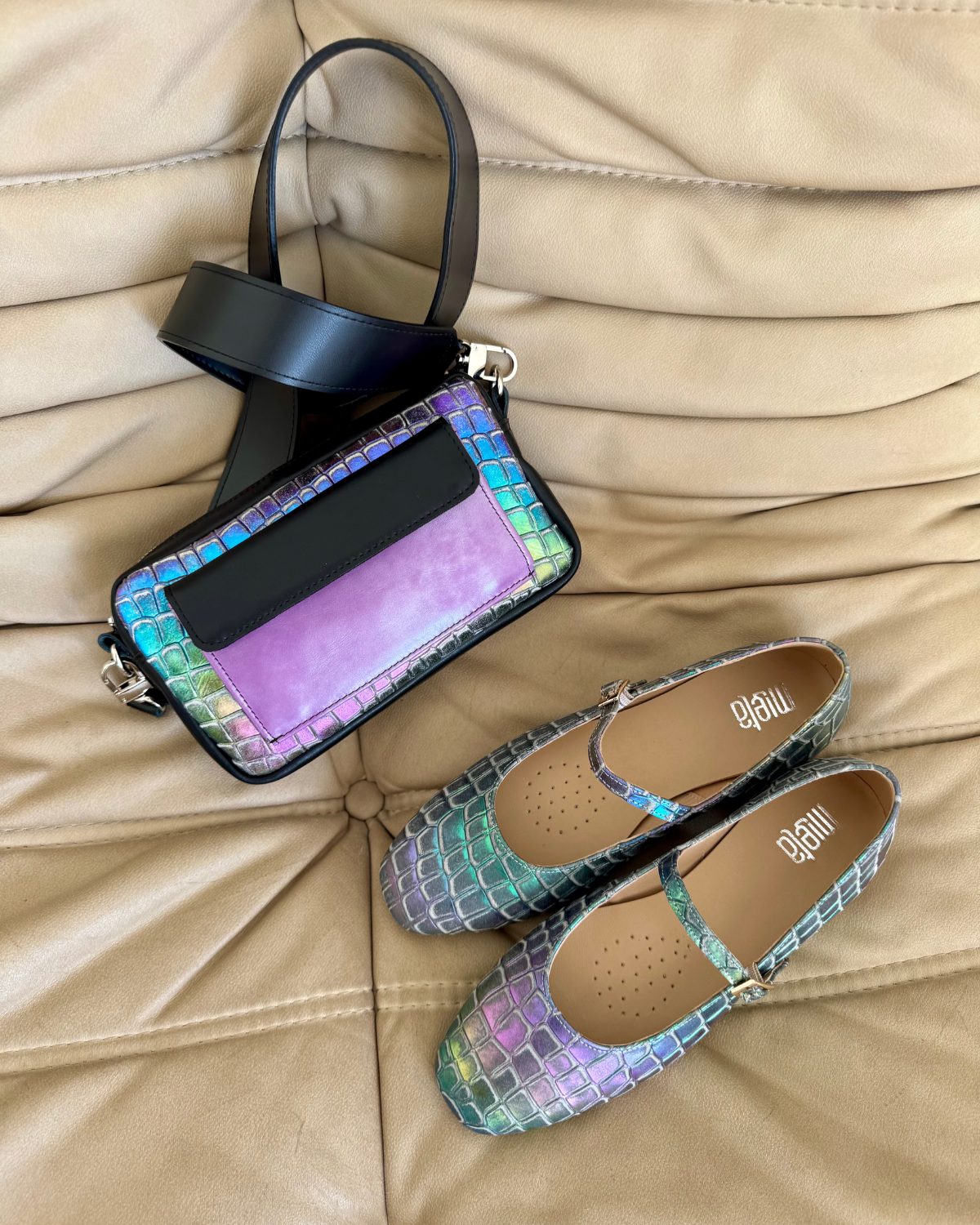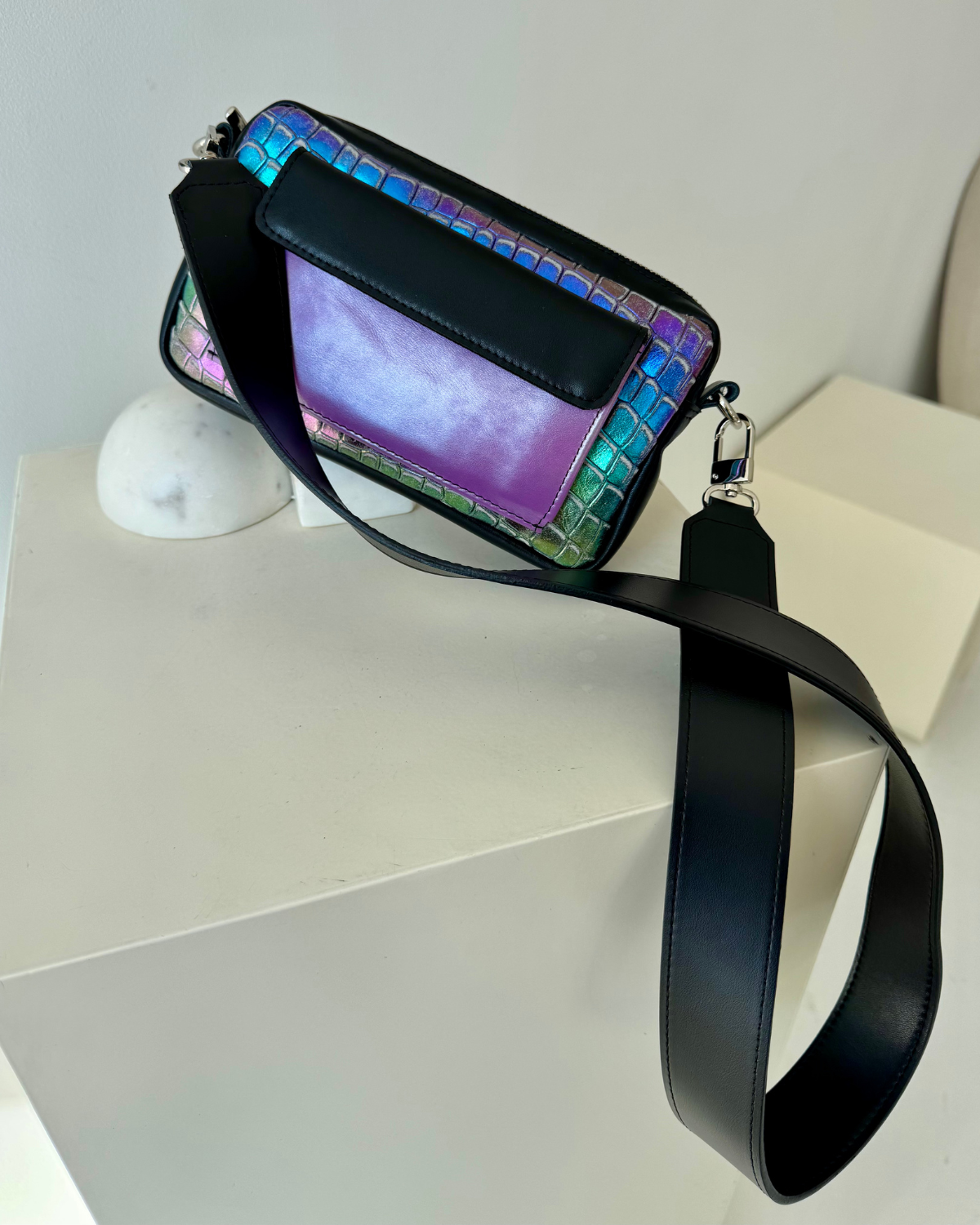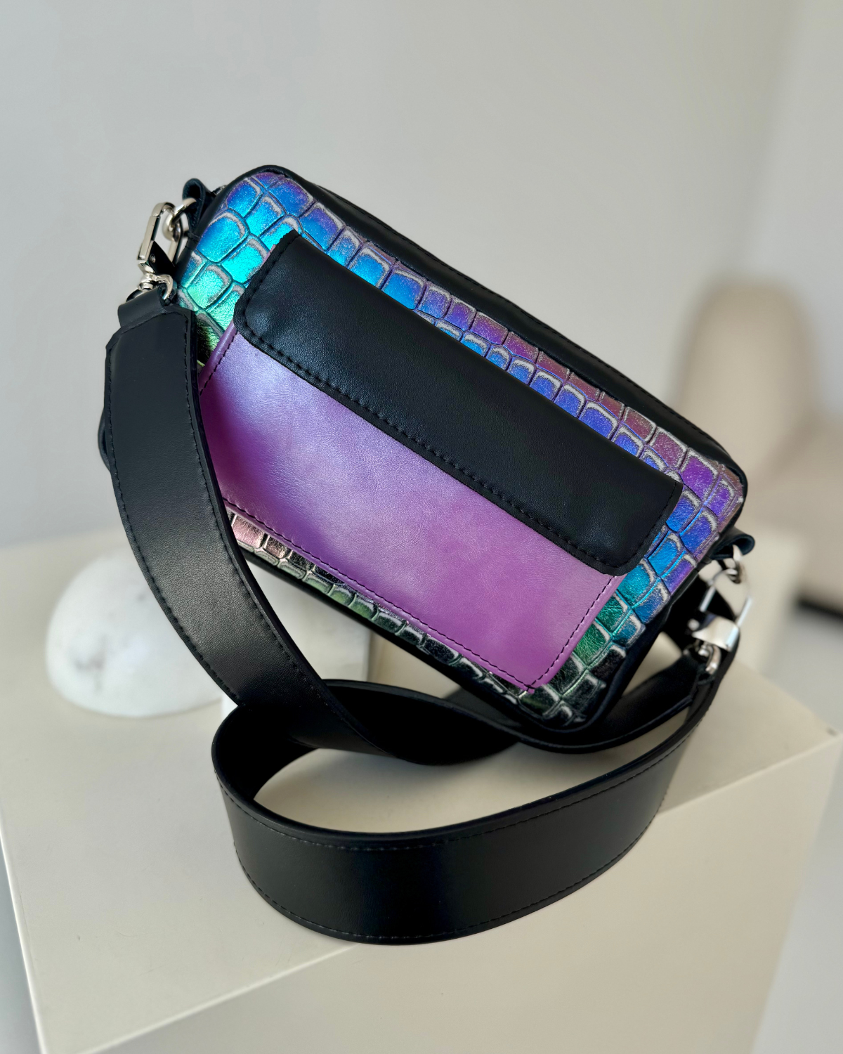 Tęczowa skóra charakteryzuje się bogactwem kolorów, które mogą różnić się układem i proporcją w porównaniu do egzemplarza przedstawionego na zdjęciach. Ma to związek z unikalnymi cechami materiału użytego do produkcji. W niektórych miejscach skóra posiada naturalne przetarcia, które dodają jej charakteru – to zamierzony efekt, który powstaje podczas produkcji. Z upływem czasu efekt ten może się pogłębiać, co jest naturalną cechą tego rodzaju skóry.