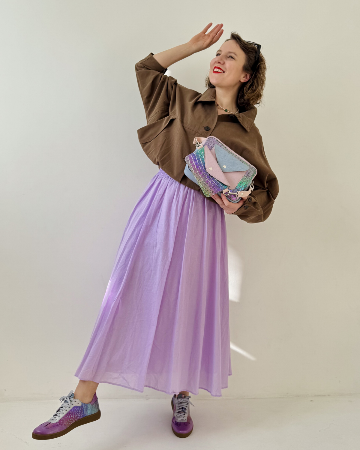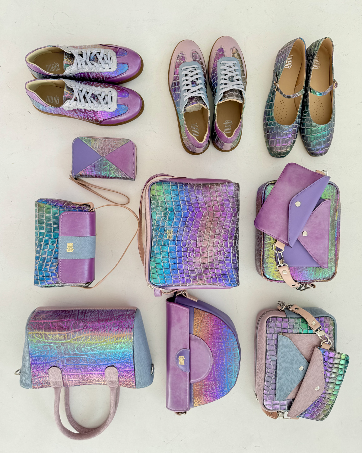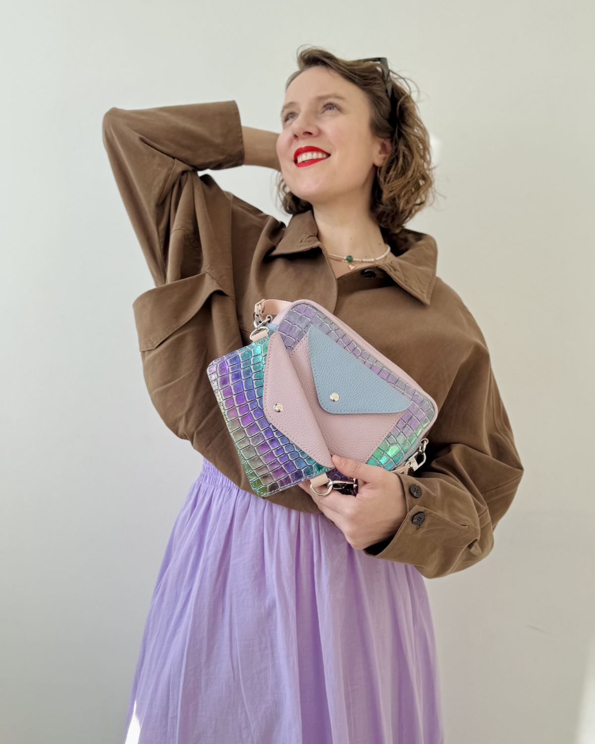 W tym przypadku to jest tęczowa skóra mieniąca się piękną feerią barw! Subtelna lilia idealnie komponuje się z pastelowym tłoczeniem w stylu krokodylej łuski i tęczowymi kolorami. Niewielki dodatek gołębiej szarości na klapie kieszeni dopełnia całość.