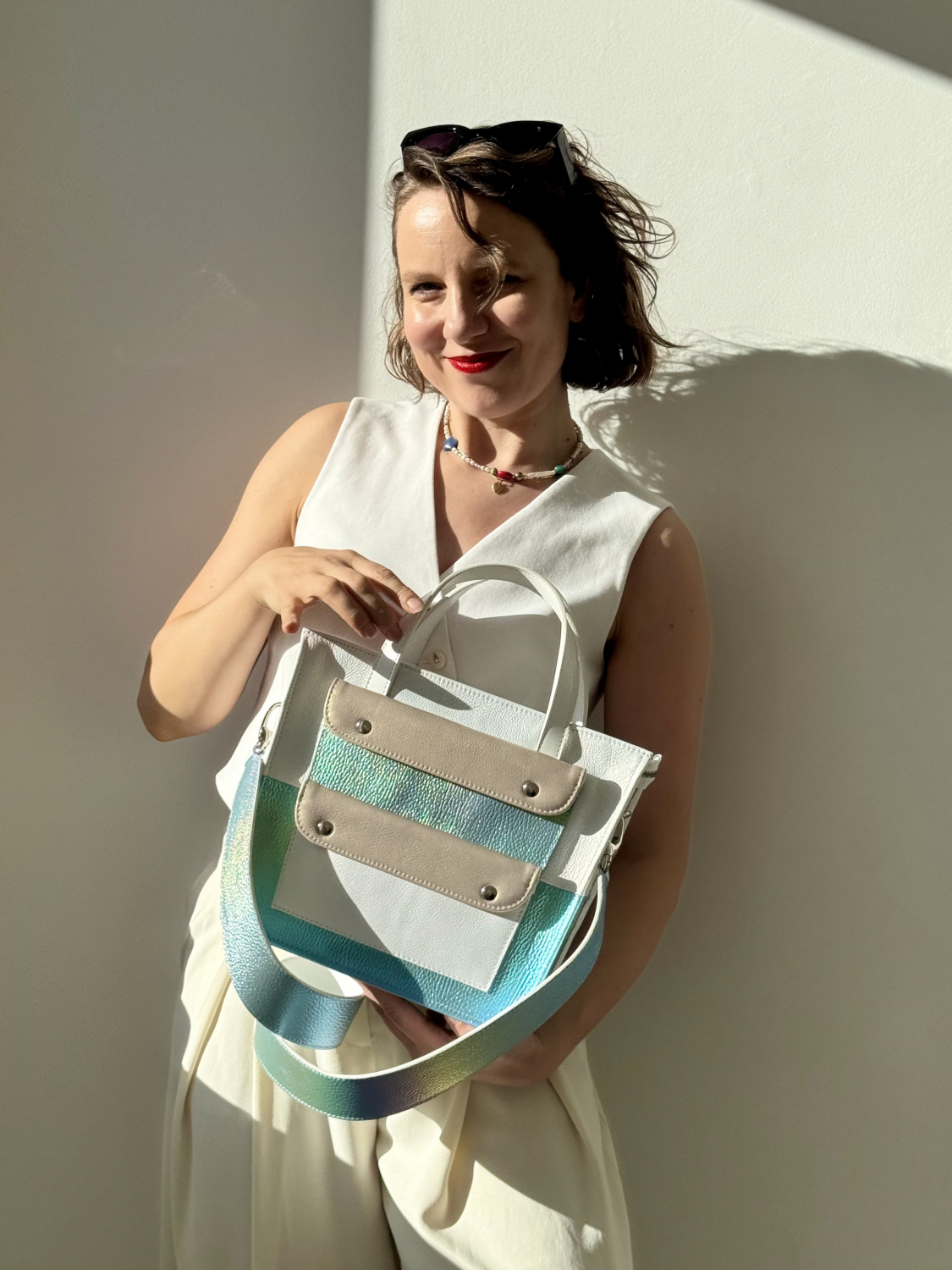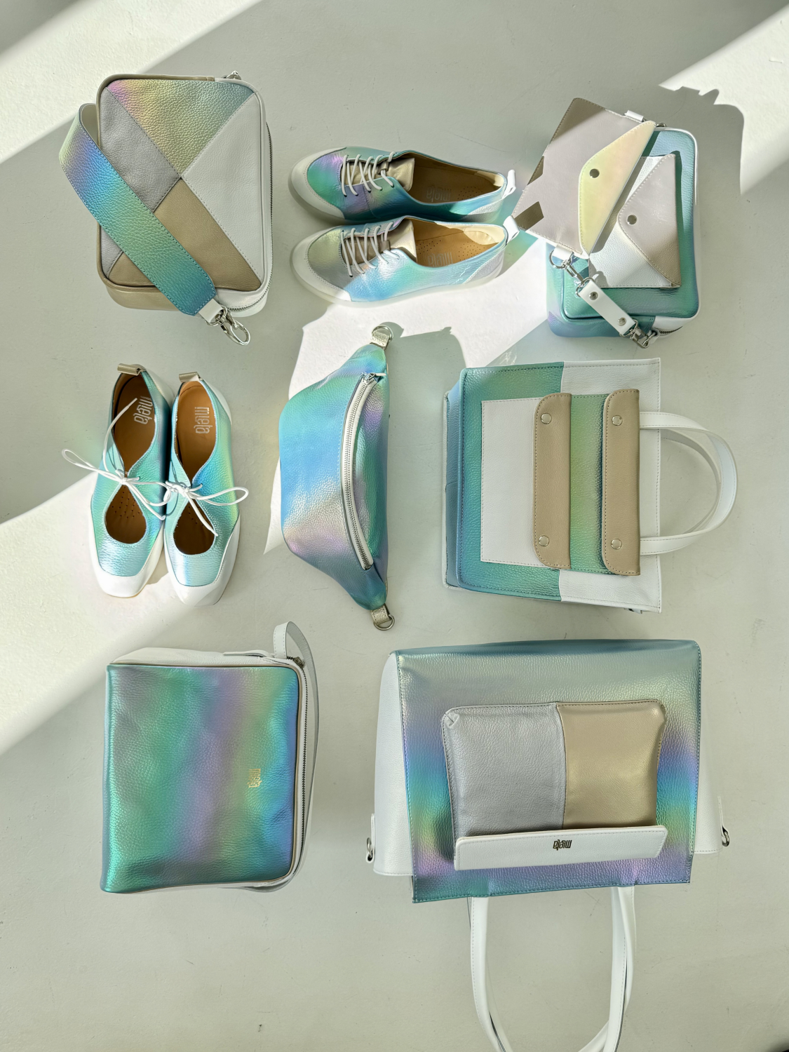 I choć jej funkcje zdominowały początek opisu- uroda dorównuje funkcjonalności. Torba skonstruowana jest tak by pięknie łączyć barwy i faktury, jak na Miętę przystało. W tym modelu połączyliśmy biały kosmiczny pył, z piękną hologramową skórą z przewagą jasnego błękitu i przebijających się żółcieni i delikatnych róży.